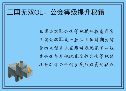 三国无双OL是一款以三国时期为背景的大型多人在线游戏,玩家可以组建公会与其他玩家合作。公会等级的提升对于公会的发展和成员的福利都至关重要。本文将为大家介绍一些提升公会等级的有效方法,帮助公会迅速成长壮大。